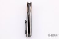 This Accentor by Chuck Gedraitis features a clip point bowie style blade with a fileworked flipper. The handle has orange peel finished and anodized titanium bolsters, black G-10 scales, orange peel finished titanium liners, green G-10 backspacer and a tip up orange peel finished zirconium clip with hidden screws. Excellent condition. Nice detent, lockup, action and blade seating. Comes with COA.