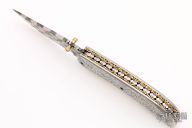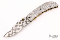 This knife features a Damascus blade with thumbstud and fileworked thumbrest. The handle has engraved stainless steel scales, fileworked brass liners, fileworked stainless steel backspacer. Nice lockup and blade seating. Comes with a brown leather sheath. Excellent condition.