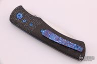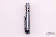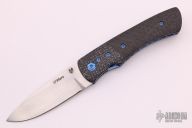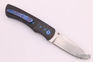 This linerlock folder by Sean O'Hare features a hand rub satin finished blade with a single thumbstud. The handle has silver lightning strike carbon fiber bolsters and backspacer, marble carbon fiber scales, anodized titanium liners with jeweled interiors, tip up timascus clip, anodized titanium hardware. Smooth action. Nice blade seating, detent, and lockup. Very nice work. Comes with a nylon pouch and COA, dated 12/4/19. Excellent condition.