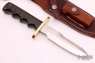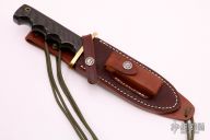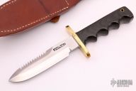 This Model 15 from Randall Made Knives features a satin finished spear point blade with sharpened top edge and sawteeth, .215" blade stock and 1.181" blade depth, full tang construction. The handle is comprised of a brass guard and black linen micarta finger grip style handle. Comes with brown leather sheath. Excellent condition.