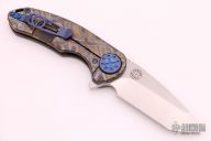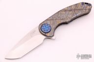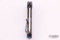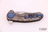 This F3 by Curtiss Knives features a stonewashed blade with notched thumbrest and flipper. The handle has an anodized/textured titanium frame with an anodized titanium tip up pocket clip and hardware. Rides on bearings, nice detent and lockup.  Includes a padded zippered case and COA, dated 10-3-17.  Excellent Condition.