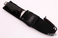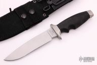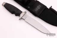 This Old Stlye LMF Tactical by Gerber features a bead blasted drop point blade with .231" blade stock and 1.218" blade depth, hidden tang construction. The handle has bead blasted stainless steel guard and butt and a rubber handle. Comes with black nylon sheath. S/N 002273. Has some light staining on the butt and guard, otherwise excellent condition.