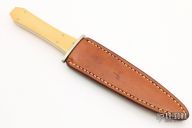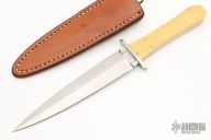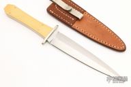 This Arkansas Toothpick by Jimmy Lile features a hand rub satin finished double edged blade, .177" blade stock and 1.309" blade depth, full tapered tang construction. The handle has a nickel silver double guard, yellow paper micarta scales and nickel silver pins. Comes with a brown leather sheath with boot clip. Has a few light scratches, otherwise excellent condition.