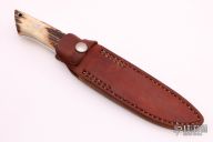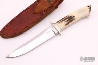 This fighter by Kuzan Oda features a mirror polished drop point blade with swedges on the spine, .233" blade stock and 1.103" blade depth, full tapered tang construction. The handle has a nickel silver guard, stag scales and red liners. Comes with a brown leather sheath. Excellent condition.