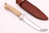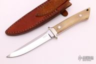 This fighter by Kuzan Oda features a mirror polished drop point blade with swedges on the spine, .237" blade stock and .902" blade depth, full tapered tang construction. The handle has a nickel silver guard, honey horn scales and red liners. Comes with a brown leather sheath. Excellent condition.