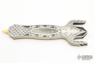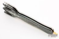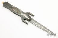 This Auto by Master Smith Ron Newton features a Damascus blade with false top edge. The handle has a stainless steel frame with black lip pearl inlays and a gold backspacer.  Half of the frame has been blued. The handle has been beautifully engraved and has gold inlays. The release is hidden among one of the forward prongs.  Stunning piece, amazing attention to detail.  Includes a padded zippered case.  Hairline scratches are visible on the frame, and a couple dings on the inside edge of the black scale, otherwise the knife is in Excellent Condition.