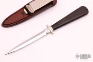 This Boot Knife by Pat Crawford features a mirror finished double edged blade with .175" blade stock and .440" blade depth, hidden tang construction. The handle has nickel silver guard, black linen micarta grip with a black spacer. Comes with a brown leather sheath with a clip. #133 on the blade. Excellent condition.