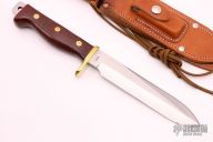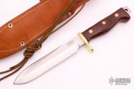 This fighter from Martin Knives features a satin finished spear point blade with a partially sharpened top edge, .221" blade stock and 1.23" blade depth, full tang construction. The handle has a brass guard and pins complimented by a micarta grip.  Includes a brown leather sheath with a sharpening stone.  Excellent Condition.