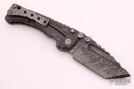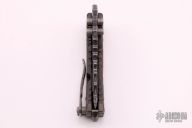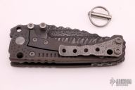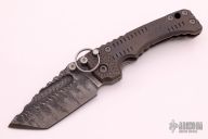 This Custom T-1 Folder by Miller Brothers Blades features a Z-Wear PM tanto blade with textured spine, fullers, notched thumbrest and dual thumbstuds. The handle has a milled and textured titanium frame, matching tip up clip and a steel backspacer. Comes with a pin that can be inserted into the handle when open to lock the blade in the open position. Comes with original Pelican case and COA. Excellent condition.