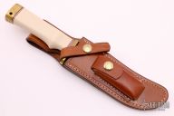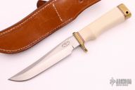 This Hunter by Martin Knives features a satin finished clip point blade with notched thumbrest, .210" blade stock and 1.217" blade depth, hidden tang construction. The handle has a brass guard, white paper micarta grip with red/white/black spacers and a brass butt. Comes with brown leather sheath. #07 on choil and back of sheath. Excellent condition.