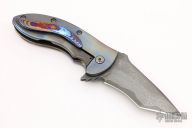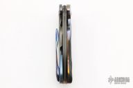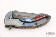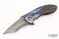 This Hornet Framelock flipper by Alistair Bastian features a San Mai Damascus tanto recurve blade with fileworked spine and flipper. The handle has a timascus bolster, carbon fiber scale, anodized titanium liner and lockside with orange peel finish, tip up mokuti clip with hidden screws, timascus inlaid pivot, polished and fileworked stainless steel backspacer. Comes with hard case. #111 inside backspacer. Rides on caged bearings. Nice detent, lockup and blade seating. Very nice piece for any collection. Excellent condition.
