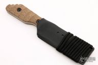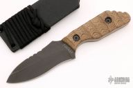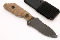 This is a Duane Dwyer custom knife with a black coated blade and a contoured natural canvas micarta scales, has sharpened and serrated  top edge, .111" blade thickness and 1.484" blade depth, full tang construction. Nice feel in the hand. Has some minor sheath marks on blade, otherwise excellent condition. Comes with a kydex sheath.