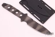 This TAD edition DUK2 by Strider Knives features a tiger striped blade with nearly sharpened and serrated top edge, .194" blade stock and 1.265" blade depth, full skeletonized construction. Comes with a kydex sheath. Has some scratches/scuffs, otherwise excellent condition.