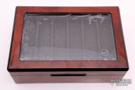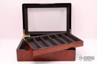 This Collector Display Case by William Henry Fine Knives features laminated wood construction with brass hinges and a beveled glass window with etched William Henry logo. The upper lined compartment is removable which allows access two a lower compartment. Both compartments have storage for 6 knives. Includes the original WH box. Excellent condition.