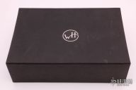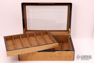 This Collector Display Case by William Henry Fine Knives features laminated wood construction with brass hinges and a beveled glass window with etched William Henry logo. The upper lined compartment is removable which allows access two a lower compartment. Both compartments have storage for 6 knives. Includes the original WH box. Excellent condition.