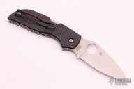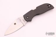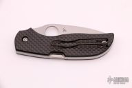 This knife by Spyderco features a satin finished drop point blade with a thumbhole and notched thumbramp.  The handle features steel liners/backspacer, a black tip up pocket clip and carbon fiber scales.  Includes the original box and papers.  Excellent Condition.