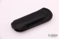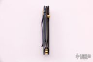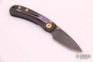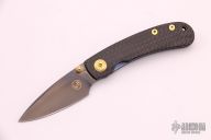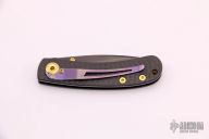 This folding linerlock from William Henry fine knives features a tungsten DLC coated ATS-34 drop point blade with a single thumbstud. Carbon fiber handle sits overtop of a blue colored liner on the lock side of the knife. 24K gold coated hardware/thumbstud and anodoized titanium tip down pocket clip matches the liner. The knife opens easily one handed and locks up tight with no blade play. Includes the original box and papers. Light scratches are visible on the blade otherwise the knife is in excellent condition.