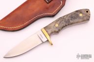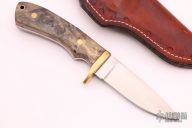 This fixed blade from Perry Wingo features a drop point satin finish blade, .140" blade stock and 1.121" blade depth, full tang construction. The handle is comprised of a brass guard and California buckeye burl scales with brass pins over red liners. Brass lanyard tube in pommel. Includes leather sheath with a belt loop. Excellent condition.