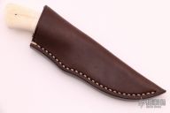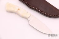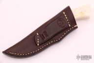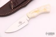 This "Gecko" from the Bush Baby series features a hand rub satin finished drop point N690 blade, .093" blade stock and .949" blade depth, full tang construction. The handle has warthog tusk scales. Comes with a brown leather sheath. Excellent condition.