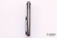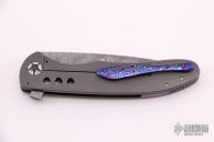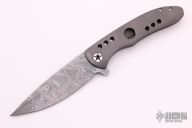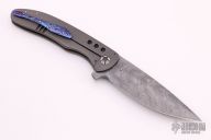 This Jolt flipper from Jonas Iglesias features a Damascus (might actually be Damasteel) blade with notched flipper. The handle has a tumbled titanium frame, two-tone pivot, floating mokuti backspacer and tip up clip with hidden screws. Rides on bearings, nice detent, lockup and blade seating. Excellent condition. Comes with a zippered case. From the 2019 Gathering.