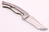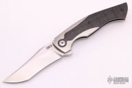 This Coyote Flipper by Emmanuel Le Brun features a hand rub satin finished blade with flipper. The handle has a blasted titanium frame and backspacer, fat carbon inlay, titanium tip up clip. Very smooth. Nice detent, lockup and blade seating. Excellent condition. Comes with original zippered case.