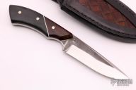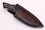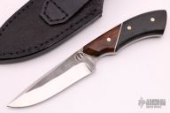 This Knife by Jamison Chop was an Apprentice under Master Smith Murray Carter, it features a two-tone San Mai blade with .134" blade thickness and .948" blade depth, full tapered tang construction. The handle has ironwood bolsters, black canvas micarta scales with white liners, nickel silver pins. Comes with a black/brown leather sheath by Stonefloor Leather Works. Excellent Condition.