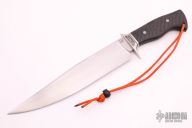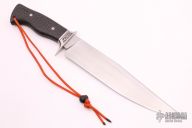 This XL Bowie by Cass Stanford features a hand rub satin finished blade with .246" blade stock and 1.932" blade depth, hidden tang construction. The handle has an engraved stainless steel guard and pins with a carbon fiber grip. Comes with a zippered case. Excellent condition.