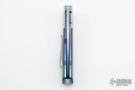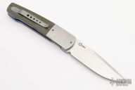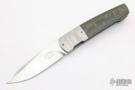 This LL07 linerlock flipper by Herucus Blomerus features a hand rubbed, satin finished blade with polished flats and flipper. The handle has fluted stainless steel bolsters, camo/green G-10 scales with anodized titanium liners, stainless steel backspacer and a tip up titanium clip. Blade is centered when closed, nice detent and lockup. Very smooth flipping action, rides on IKBS. Comes with velcro case. Excellent condition.