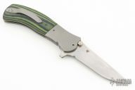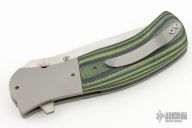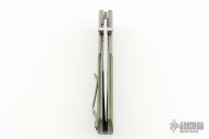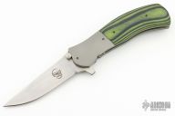 This Monkey Edge Exclusive Linerlock Flipper by Aaron Frederick features a hand rub satin finished blade with dual thumbstuds and flipper. The handle has bead blast titanium liners and bolster, black/green G-10 scales, black G-10 backspacer, and tip up bead blast titanium clip. Nice detent, lockup and blade seating. Excellent condition. Comes with a zippered case.