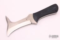 This Zombie Slayer by Aaron Frederick features a satin finished blade with .280" blade stock and 3.175" blade depth, full tang construction with black/blue G-10 scales. Excellent condition.