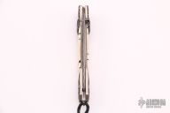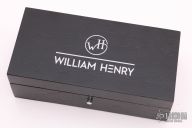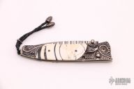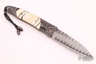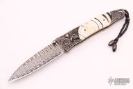 This B30 Victory from William Henry Fine Knives features a Wave Damascus blade with ZDP-189 core, single thumb stud with a diamond inset in a gold bezel. The handle has a hand carved sterling silver with 10,000 year-old fossil Woolly Mammoth tusk inlays and diamond inset in gold bezel on button lock. Leather lanyard with beads on pommel. Includes original presentation box, paperwork and leather sheath with pocket clip. Excellent condition. Dated June 19, 2015 and #139/250.