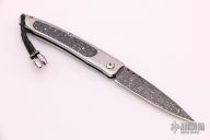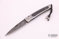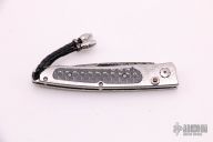 This Knife features a Rob Thomas Dot Matrix Damascus blade with a single nail nick.  The handle features a deep etched polished Damascus frame with lightening strike carbon fiber inlays.  Production Date: September 18, 2013.  S/N136-0167.  Includes the original box and COA.  Excellent Condition.