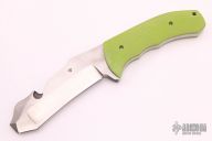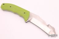 This Breacher Fixed Blade by Aaron Frederick features a satin finished blade with gut hook and notched thumbrest, .276" blade stock and 1.496" blade depth, full tang construction. The handle has green G-10 scales. Excellent condition.