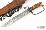 This Frontier Style Bowie by John Cohea features a forge finished and hammer marked blade with .257" blade stock and 1.759" blade depth, hidden tang construction. The handle has a forged wrought iron D-Guard, fossil walrus ivory grip with copper collar, escutcheons and butt. Comes with a rawhide and copper sheath. Excellent condition.