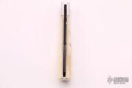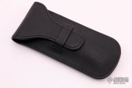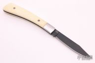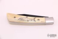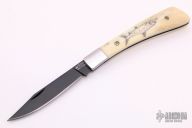 This scrimshawed slipjoint features a black clip point blade with a single nail nick.   The handle has stainless steel bolsters with bone covers.  Includes a black leather sheath.  Excellent condition.
