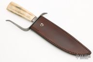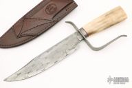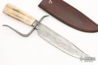 This bowie by Journeyman Smith Larry J Cox features a Canaster Ball Bearing Damascus blade with false top edge, .214" blade stock and 1.635" blade depth, hidden tang construction. The handle has a twist Damascus guard, walrus ivory grip and red/black spacers. Comes with a brown leather sheath by Rowe's Leather. Excellent condition.