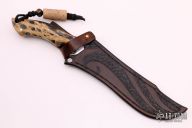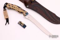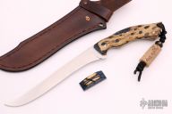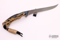 This fillet knife by Rob Dellenger features a satin finished blade with fileworked spine, .068" blade stock and 1.190" blade depth, full tang construction with filework along tang spine. The handle has Cholla Cactus and oceanic colored resin scales, has lanyard with cork to keep it from sinking to the bottom if dropped in the water. Comes with a hand tooled brown leather sheath, leather pouch and a display stand. Comes with COA. New from maker. Very flexible blade.
