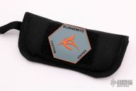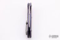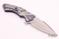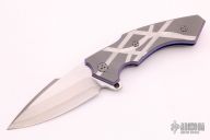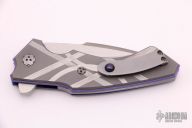 This White Swan Flipper from Allen Elishewitz features a San Mai Damascus drop point blade with swedge and flipper. The handle is comprised of titanium scales with Guilloche over textured and anodized titanium liners and two tone stainless steel backspacer. Bead blasted stainless steel tip up pocket clip with anodized titanium ball insert. Includes padded velcro case and "Elishewitz Custom Knives" patch. Excellent condition.