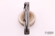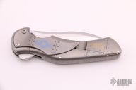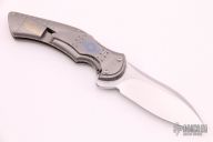 This Custom Mini Junkyard Dog by Tim Galyean features a hand rub satin finished blade with notched flipper. The handle has a milled titanium frame with matching tip down clip. Rides on bearings, nice detent, lockup and blade seating. Comes with a zippered case. Excellent condition.