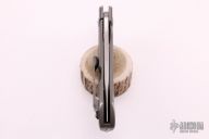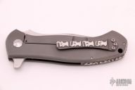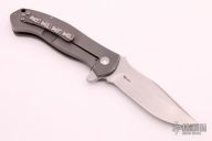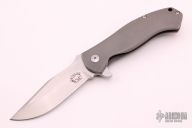 These Deluge flippers are a designed by D.B. Fraley and produced by Reate Knives. The hand ground blades feature a hand rubbed, satin finish. The handle is crafted from bead blasted titanium. The backspacer and pocket clip are also titanium and feature Fraley's "Lost Souls" pattern. Pocket clip is positioned for tip up carry. Blades are centered when closed, knives flip well with no wrist action needed, and have nice crisp detent. Comes in a padded/zippered case. Has a few light scuffs, otherwise excellent condition.
