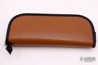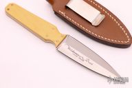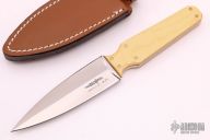This dagger by Gil Hibben features a satin finished double edged blade with .138" blade stock and 1.185" blade depth, full tang construction. The handle has ivory paper micarta scales with red liners and brass pins. Comes with a brown leather sheath and a zippered case. Excellent condition. Dated 6-80