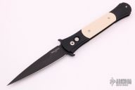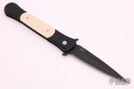 "Classic styling, modern 3D CNC Machining, and unequaled craftsmanship have all come together perfectly for our newest auto knife - THE DON. The frames and inlays for each DON are completely 3D machined, curved and fluted for a completely custom feel. Super smooth coil spring action! Because of the complex machining and amount of detailed hand work involved with the DON, their production will be very limited each year." This large Don features a black blade and anodized aluminum frame with ivory micarta inlays. Includes original box.  Excellent Condition.  PR3 #47