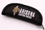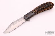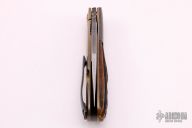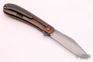This Backpocket flipper from Doc Shiffer features a 1095 blade with hamon. The handle scales are bronze anodized titanium with a stag scale and zirconium bolster. The pocket clip is also crafted from zirconium and is positioned for tip up carry. The blade is centered when closed and locks up with no play. Strong detent. Includes a zippered case. Has a couple light scratches, otherwise excellent condition.