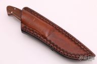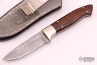 This knife by S Godfrey features a Damascus blade with .116" blade stock and .901" blade depth, full tang construction. The handle has dovetailed nickel silver bolsters, wood scales. Comes with a hand tooled brown leather sheath. Has some light scratches, otherwise excellent condition.