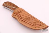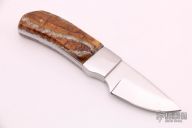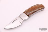 This fixed blade by Jim Craig features a mirror polished drop point blade with .113" blade stock and .965" blade depth, full tang construction. The handle is comprised of stainless steel bolsters and mammoth tooth scales over white liners. Includes a hand tooled brown leather sheath with belt loop. Has some light scratches, otherwise excellent condition.