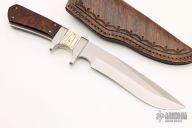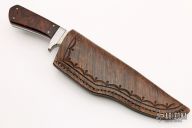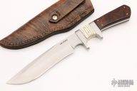 This fixed blade by Jim Craig features a satin finished recurve blade with .143" blade stock and 1.213" blade depth, full tang construction. The handle is comprised of stainless steel guard  and sub-hilt with mammoth ivory and ironwood scales. Includes a hand tooled brown leather sheath with belt loop. Has some light scratches and a couple cracks in the wood scales, otherwise good condition.