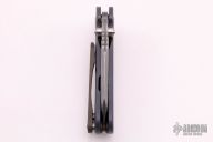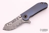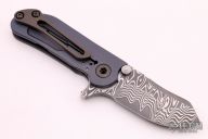 This Mini M8 Flipper by Direware Custom Knives features a Damascus blade with swedge, notched thumbrest, and flipper. The handle is comprised of a blasted and anodized titanium frame with, anodized and blasted titanium barrel spacers and tip up clip. Nice blade seating, detent and lock up, rides on bearings. Comes with original box. Excellent condition.