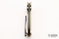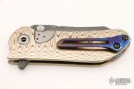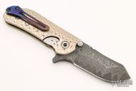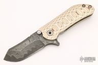 This M8 Flipper by Direware Custom Knives features a San Mai Damascus blade with swedge, notched thumbrest, dual blade stops and flipper. The handle is comprised of a 3-alloy mokume frame with a timascus back spacer and tip up clip, has an inlaid titanium lockbar. Comes with original box. Excellent condition.