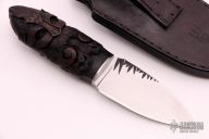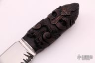 This Trilogy "Odin's Warriors" - "Einherjar" by Pavel Borislavov Bozhinov features a hand rub satin finished blade with fileworked spine, .140" blade stock and 1.168" blade depth, hidden tang construction. The handle has a stainless steel guard, juniper wood grip with fine hand carving. Comes with a black leather sheath with "Bark" texture. Comes with COA. New from maker. The carving on this knife is fantastic!