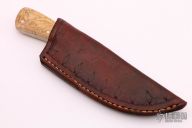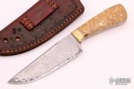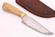 This Hunter by Steve Frist features a San Mai Damascus blade with .103" blade stock and 1.269" blade depth, full tang construction. The handle has brass bolsters, maple burl scales with nickel silver pins. Comes with a hand tooled brown leather sheath belt loop. New from maker.